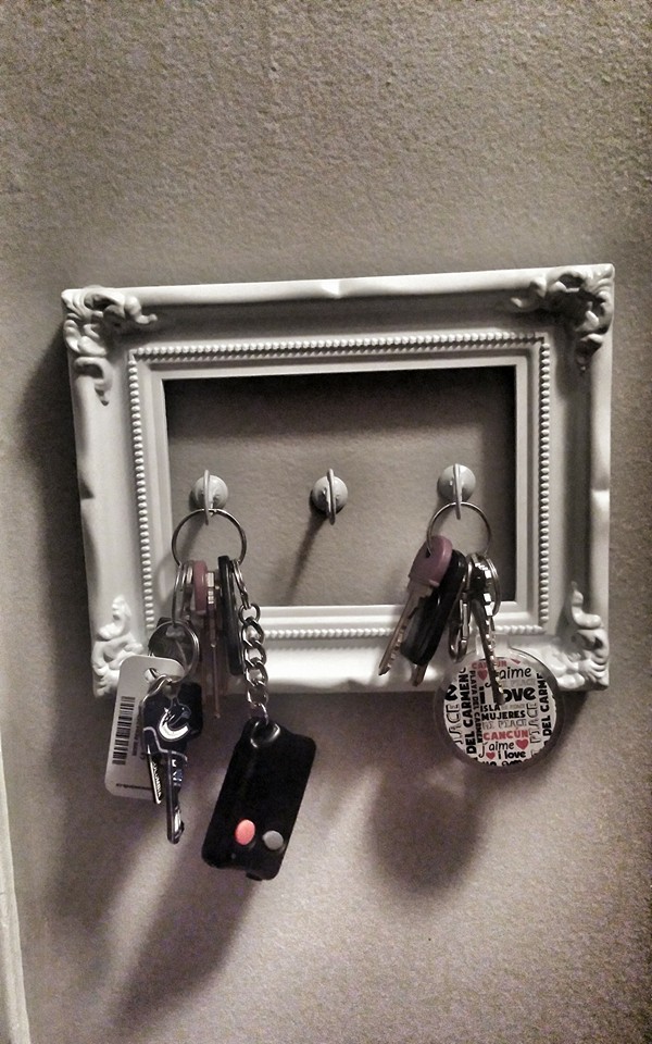 I got a picture frame and removed the backing and put it on my wall, and bought the same style hooks and voila! Little chic, super easy and cheap key holder! I spent under $5 on everything and if I ended up buying one I would have ended up spending more money and not nearly as cute :)